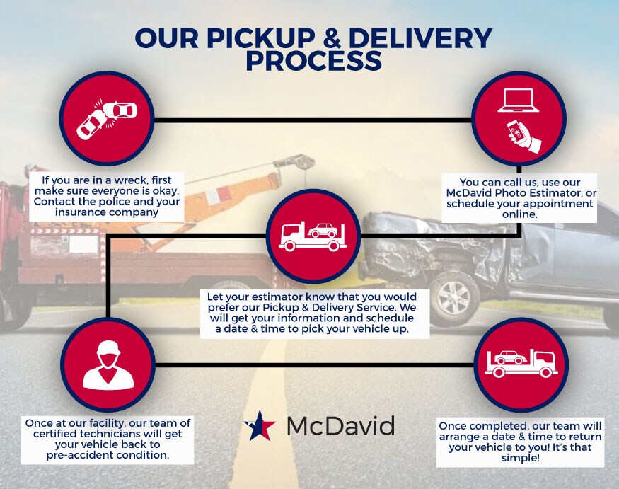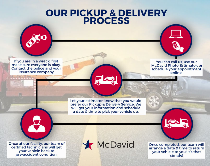We all know that getting your vehicle repaired after an accident can be stressful and an extremly frustrating process. At McDavid Collision Centers, located around the Dallas/Fort Worth area, we want to make sure that your entire repair process is easy from start to finish, and that starts with how your vehicle gets to us. Our collision centers offer a Pickup & Delivery service so you can get your vehicle repaired without having to visit our body shop. Schedule your appointment at one of our 2 locations and we will come pick your vehicle up: Fort Worth, Irving. Once the work is completed, we will drop your vehicle back off to you!